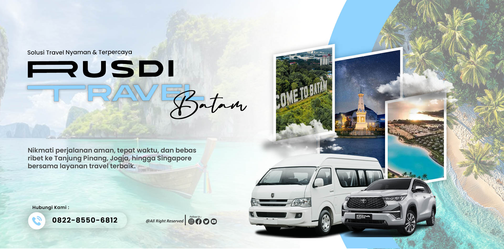 RUSDI TRAVEL BATAM (RTB) adalah penyedia layanan transportasi dan travel terpercaya yang berbasis di Batam, melayani berbagai kebutuhan perjalanan seperti wisata, bisnis, hingga kunjungan keluarga. Kami menyediakan rute populer seperti Batam, Tanjung Pinang, Bintan, Jogja, hingga perjalanan internasional ke Singapore, dengan sistem layanan yang fleksibel, mudah, dan mengutamakan kenyamanan pelanggan.